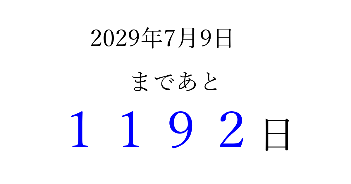 2029年7月9日(月)まで あと 9999 日です 追加すると、トップページからすぐ選べるようになります ※2026/04/04現在の結果です。 最新の状態に更新する ↓シェアして、タイムライン上にカウントダウンを表示しよう!↓ 📤 この結果を共有する Tweet シェア Threads Bluesky 別の日付でカウントダウン 2029年7月のカレンダー このページをブックマークに追加すると、いつでもカウントダウンを確認できます。 (PC: Ctrl+D / Mac: ⌘+D) hitome-notes.comでは以下のページも運営しています。 指定日と期間から日付を計算 | ガチャ確率計算・シミュレーション | プライバシー・ポリシー 運営者:Avocado