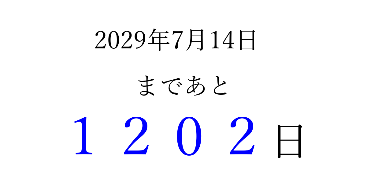 2029年7月14日(土)まで あと 9999 日です 追加すると、トップページからすぐ選べるようになります ※2026/03/30現在の結果です。 最新の状態に更新する ↓シェアして、タイムライン上にカウントダウンを表示しよう!↓ 📤 この結果を共有する Tweet シェア Threads Bluesky 別の日付でカウントダウン 2029年7月のカレンダー このページをブックマークに追加すると、いつでもカウントダウンを確認できます。 (PC: Ctrl+D / Mac: ⌘+D) hitome-notes.comでは以下のページも運営しています。 指定日と期間から日付を計算 | ガチャ確率計算・シミュレーション | プライバシー・ポリシー 運営者:Avocado