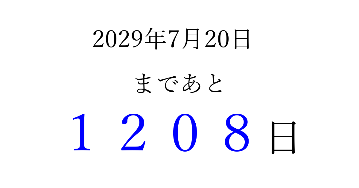 2029年7月20日(金)まで あと 9999 日です 追加すると、トップページからすぐ選べるようになります ※2026/03/30現在の結果です。 最新の状態に更新する ↓シェアして、タイムライン上にカウントダウンを表示しよう!↓ 📤 この結果を共有する Tweet シェア Threads Bluesky 別の日付でカウントダウン 2029年7月のカレンダー このページをブックマークに追加すると、いつでもカウントダウンを確認できます。 (PC: Ctrl+D / Mac: ⌘+D) hitome-notes.comでは以下のページも運営しています。 指定日と期間から日付を計算 | ガチャ確率計算・シミュレーション | プライバシー・ポリシー 運営者:Avocado