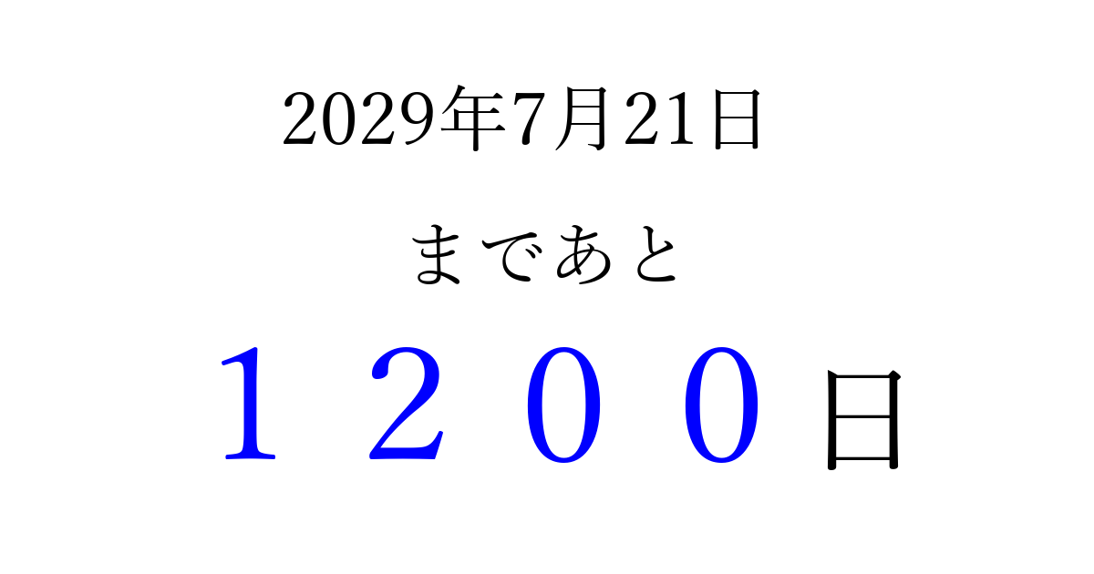 2029年7月21日(土)まで あと 9999 日です 追加すると、トップページからすぐ選べるようになります ※2026/04/08現在の結果です。 最新の状態に更新する ↓シェアして、タイムライン上にカウントダウンを表示しよう!↓ 📤 この結果を共有する Tweet シェア Threads Bluesky 別の日付でカウントダウン 2029年7月のカレンダー このページをブックマークに追加すると、いつでもカウントダウンを確認できます。 (PC: Ctrl+D / Mac: ⌘+D) hitome-notes.comでは以下のページも運営しています。 指定日と期間から日付を計算 | ガチャ確率計算・シミュレーション | プライバシー・ポリシー 運営者:Avocado