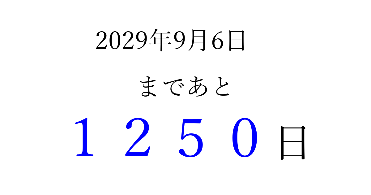 2029年9月6日(木)まで あと 9999 日です 追加すると、トップページからすぐ選べるようになります ※2026/04/05現在の結果です。 最新の状態に更新する ↓シェアして、タイムライン上にカウントダウンを表示しよう!↓ 📤 この結果を共有する Tweet シェア Threads Bluesky 別の日付でカウントダウン 2029年9月のカレンダー このページをブックマークに追加すると、いつでもカウントダウンを確認できます。 (PC: Ctrl+D / Mac: ⌘+D) hitome-notes.comでは以下のページも運営しています。 指定日と期間から日付を計算 | ガチャ確率計算・シミュレーション | プライバシー・ポリシー 運営者:Avocado