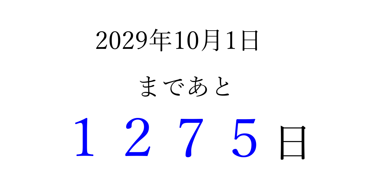 2029年10月1日(月)まで あと 9999 日です 追加すると、トップページからすぐ選べるようになります ※2026/04/05現在の結果です。 最新の状態に更新する ↓シェアして、タイムライン上にカウントダウンを表示しよう!↓ 📤 この結果を共有する Tweet シェア Threads Bluesky 別の日付でカウントダウン 2029年10月のカレンダー このページをブックマークに追加すると、いつでもカウントダウンを確認できます。 (PC: Ctrl+D / Mac: ⌘+D) hitome-notes.comでは以下のページも運営しています。 指定日と期間から日付を計算 | ガチャ確率計算・シミュレーション | プライバシー・ポリシー 運営者:Avocado