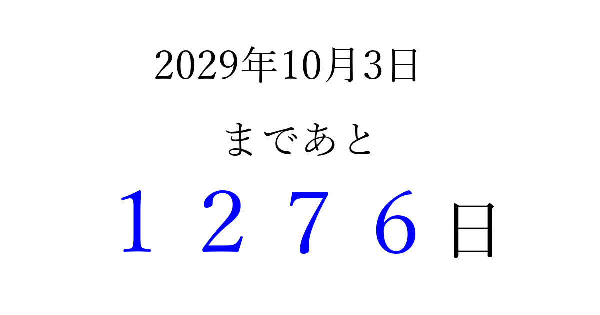 2029年10月3日(水)まで あと 9999 日です 追加すると、トップページからすぐ選べるようになります ※2026/04/06現在の結果です。 最新の状態に更新する ↓シェアして、タイムライン上にカウントダウンを表示しよう!↓ 📤 この結果を共有する Tweet シェア Threads Bluesky 別の日付でカウントダウン 2029年10月のカレンダー このページをブックマークに追加すると、いつでもカウントダウンを確認できます。 (PC: Ctrl+D / Mac: ⌘+D) hitome-notes.comでは以下のページも運営しています。 指定日と期間から日付を計算 | ガチャ確率計算・シミュレーション | プライバシー・ポリシー 運営者:Avocado