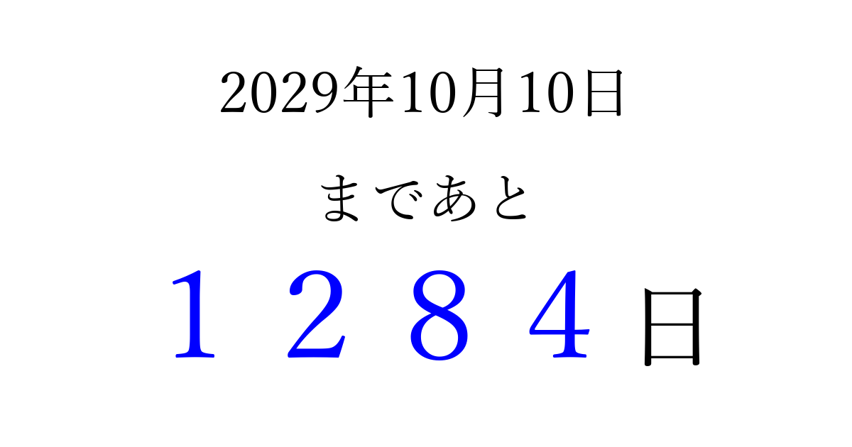 2029年10月10日(水)まで あと 9999 日です 追加すると、トップページからすぐ選べるようになります ※2026/04/05現在の結果です。 最新の状態に更新する ↓シェアして、タイムライン上にカウントダウンを表示しよう!↓ 📤 この結果を共有する Tweet シェア Threads Bluesky 別の日付でカウントダウン 2029年10月のカレンダー このページをブックマークに追加すると、いつでもカウントダウンを確認できます。 (PC: Ctrl+D / Mac: ⌘+D) hitome-notes.comでは以下のページも運営しています。 指定日と期間から日付を計算 | ガチャ確率計算・シミュレーション | プライバシー・ポリシー 運営者:Avocado