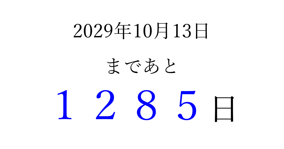 2029年10月13日(土)まで あと 9999 日です 追加すると、トップページからすぐ選べるようになります ※2026/04/07現在の結果です。 最新の状態に更新する ↓シェアして、タイムライン上にカウントダウンを表示しよう!↓ 📤 この結果を共有する Tweet シェア Threads Bluesky 別の日付でカウントダウン 2029年10月のカレンダー このページをブックマークに追加すると、いつでもカウントダウンを確認できます。 (PC: Ctrl+D / Mac: ⌘+D) hitome-notes.comでは以下のページも運営しています。 指定日と期間から日付を計算 | ガチャ確率計算・シミュレーション | プライバシー・ポリシー 運営者:Avocado