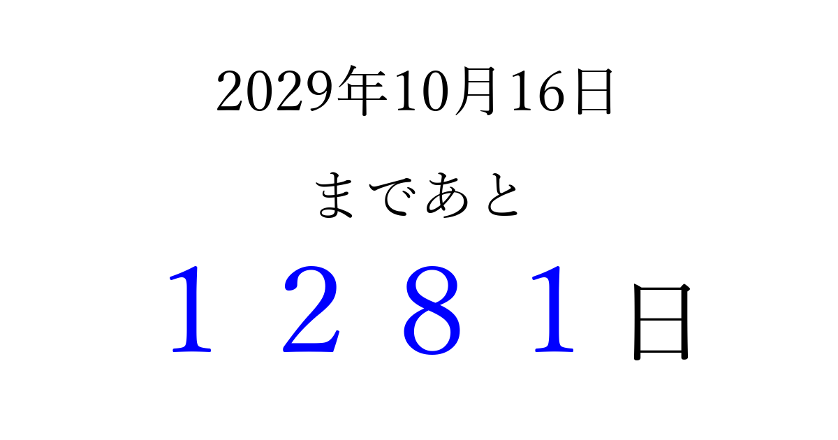2029年10月16日(火)まで あと 9999 日です 追加すると、トップページからすぐ選べるようになります ※2026/04/14現在の結果です。 最新の状態に更新する ↓シェアして、タイムライン上にカウントダウンを表示しよう!↓ 📤 この結果を共有する Tweet シェア Threads Bluesky 別の日付でカウントダウン 2029年10月のカレンダー このページをブックマークに追加すると、いつでもカウントダウンを確認できます。 (PC: Ctrl+D / Mac: ⌘+D) hitome-notes.comでは以下のページも運営しています。 指定日と期間から日付を計算 | ガチャ確率計算・シミュレーション | プライバシー・ポリシー 運営者:Avocado