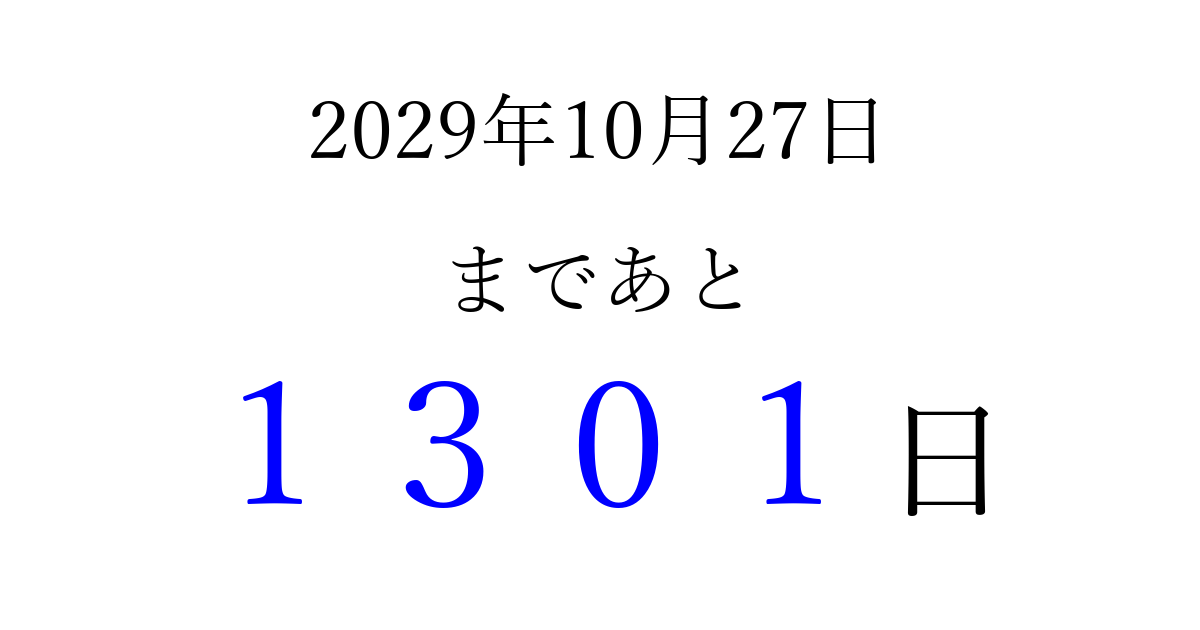 2029年10月27日(土)まで あと 9999 日です 追加すると、トップページからすぐ選べるようになります ※2026/04/05現在の結果です。 最新の状態に更新する ↓シェアして、タイムライン上にカウントダウンを表示しよう!↓ 📤 この結果を共有する Tweet シェア Threads Bluesky 別の日付でカウントダウン 2029年10月のカレンダー このページをブックマークに追加すると、いつでもカウントダウンを確認できます。 (PC: Ctrl+D / Mac: ⌘+D) hitome-notes.comでは以下のページも運営しています。 指定日と期間から日付を計算 | ガチャ確率計算・シミュレーション | プライバシー・ポリシー 運営者:Avocado