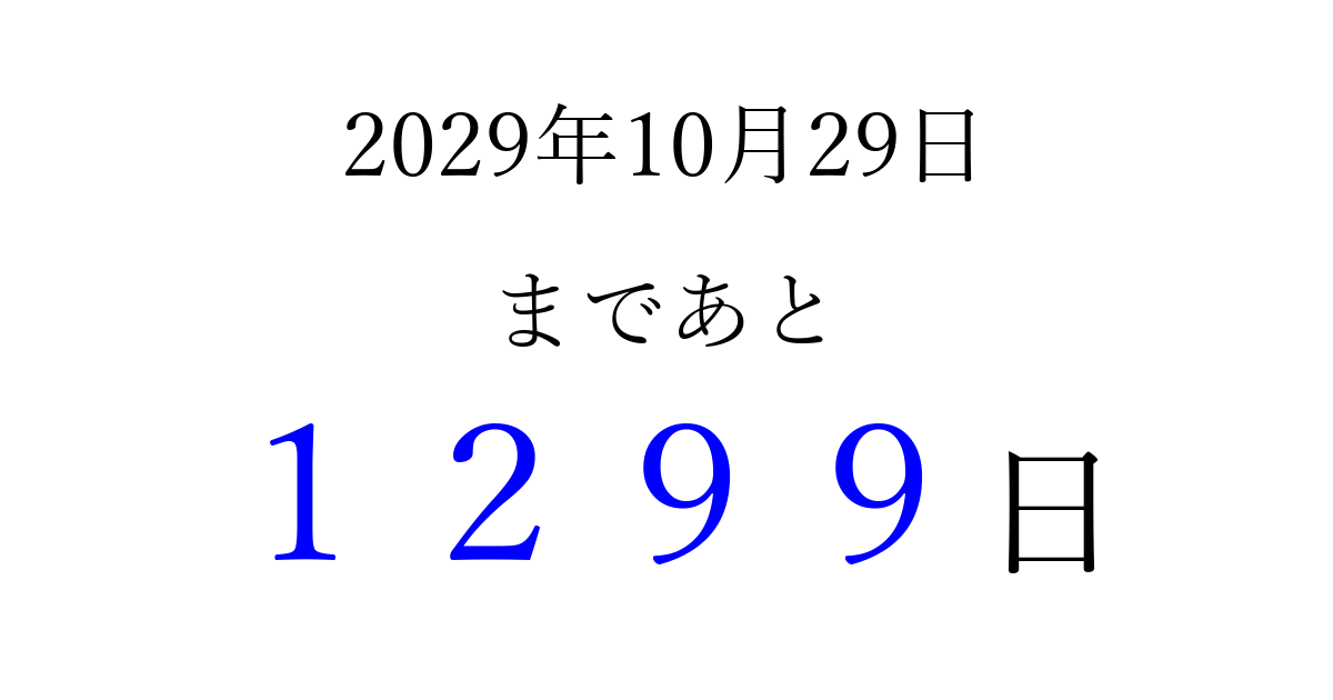 2029年10月29日(月)まで あと 9999 日です 追加すると、トップページからすぐ選べるようになります ※2026/04/09現在の結果です。 最新の状態に更新する ↓シェアして、タイムライン上にカウントダウンを表示しよう!↓ 📤 この結果を共有する Tweet シェア Threads Bluesky 別の日付でカウントダウン 2029年10月のカレンダー このページをブックマークに追加すると、いつでもカウントダウンを確認できます。 (PC: Ctrl+D / Mac: ⌘+D) hitome-notes.comでは以下のページも運営しています。 指定日と期間から日付を計算 | ガチャ確率計算・シミュレーション | プライバシー・ポリシー 運営者:Avocado