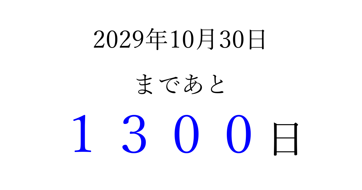2029年10月30日(火)まで あと 9999 日です 追加すると、トップページからすぐ選べるようになります ※2026/04/09現在の結果です。 最新の状態に更新する ↓シェアして、タイムライン上にカウントダウンを表示しよう!↓ 📤 この結果を共有する Tweet シェア Threads Bluesky 別の日付でカウントダウン 2029年10月のカレンダー このページをブックマークに追加すると、いつでもカウントダウンを確認できます。 (PC: Ctrl+D / Mac: ⌘+D) hitome-notes.comでは以下のページも運営しています。 指定日と期間から日付を計算 | ガチャ確率計算・シミュレーション | プライバシー・ポリシー 運営者:Avocado