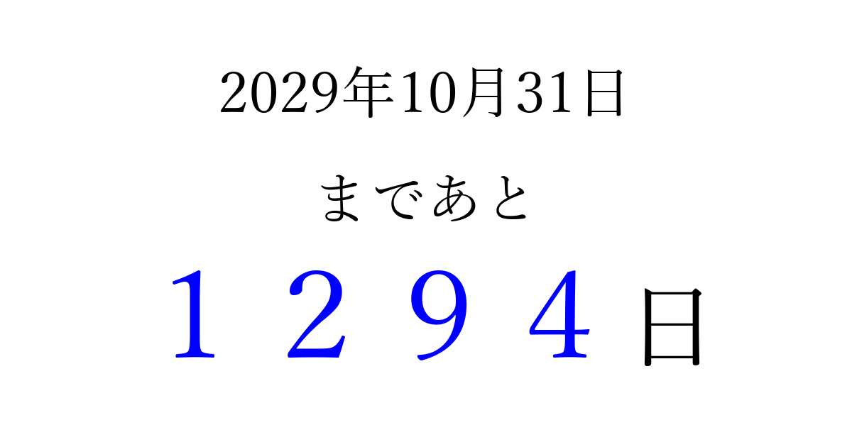 2029年10月31日(水)まで あと 9999 日です 追加すると、トップページからすぐ選べるようになります ※2026/04/16現在の結果です。 最新の状態に更新する ↓シェアして、タイムライン上にカウントダウンを表示しよう!↓ 📤 この結果を共有する Tweet シェア Threads Bluesky 別の日付でカウントダウン 2029年10月のカレンダー このページをブックマークに追加すると、いつでもカウントダウンを確認できます。 (PC: Ctrl+D / Mac: ⌘+D) hitome-notes.comでは以下のページも運営しています。 指定日と期間から日付を計算 | ガチャ確率計算・シミュレーション | プライバシー・ポリシー 運営者:Avocado