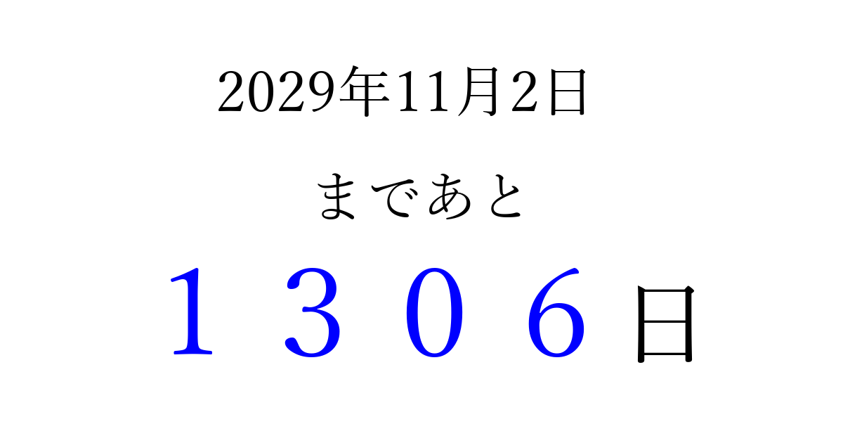 2029年11月2日(金)まで あと 9999 日です 追加すると、トップページからすぐ選べるようになります ※2026/04/06現在の結果です。 最新の状態に更新する ↓シェアして、タイムライン上にカウントダウンを表示しよう!↓ 📤 この結果を共有する Tweet シェア Threads Bluesky 別の日付でカウントダウン 2029年11月のカレンダー このページをブックマークに追加すると、いつでもカウントダウンを確認できます。 (PC: Ctrl+D / Mac: ⌘+D) hitome-notes.comでは以下のページも運営しています。 指定日と期間から日付を計算 | ガチャ確率計算・シミュレーション | プライバシー・ポリシー 運営者:Avocado