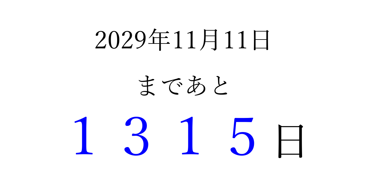 2029年11月11日(日)まで あと 9999 日です 追加すると、トップページからすぐ選べるようになります ※2026/04/06現在の結果です。 最新の状態に更新する ↓シェアして、タイムライン上にカウントダウンを表示しよう!↓ 📤 この結果を共有する Tweet シェア Threads Bluesky 別の日付でカウントダウン 2029年11月のカレンダー このページをブックマークに追加すると、いつでもカウントダウンを確認できます。 (PC: Ctrl+D / Mac: ⌘+D) hitome-notes.comでは以下のページも運営しています。 指定日と期間から日付を計算 | ガチャ確率計算・シミュレーション | プライバシー・ポリシー 運営者:Avocado