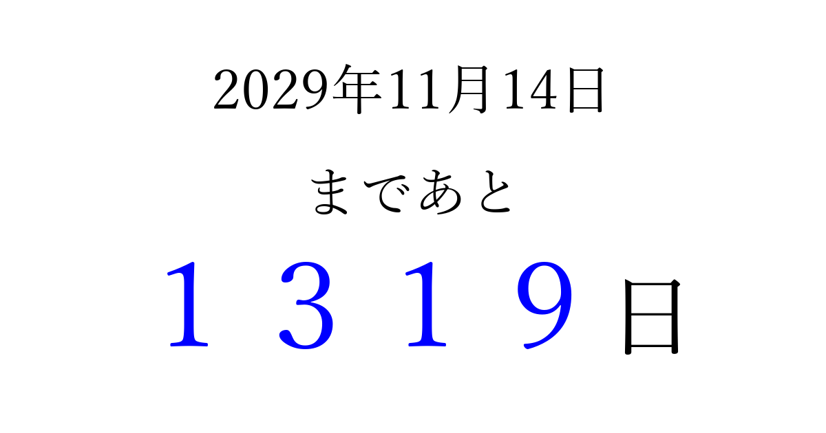 2029年11月14日(水)まで あと 9999 日です 追加すると、トップページからすぐ選べるようになります ※2026/04/05現在の結果です。 最新の状態に更新する ↓シェアして、タイムライン上にカウントダウンを表示しよう!↓ 📤 この結果を共有する Tweet シェア Threads Bluesky 別の日付でカウントダウン 2029年11月のカレンダー このページをブックマークに追加すると、いつでもカウントダウンを確認できます。 (PC: Ctrl+D / Mac: ⌘+D) hitome-notes.comでは以下のページも運営しています。 指定日と期間から日付を計算 | ガチャ確率計算・シミュレーション | プライバシー・ポリシー 運営者:Avocado