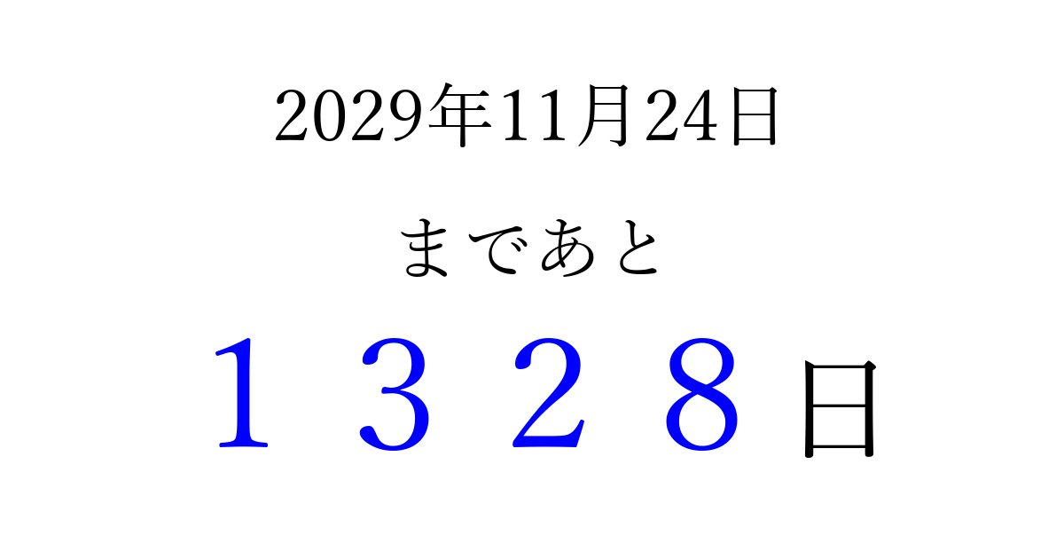 2029年11月24日(土)まで あと 9999 日です 追加すると、トップページからすぐ選べるようになります ※2026/04/06現在の結果です。 最新の状態に更新する ↓シェアして、タイムライン上にカウントダウンを表示しよう!↓ 📤 この結果を共有する Tweet シェア Threads Bluesky 別の日付でカウントダウン 2029年11月のカレンダー このページをブックマークに追加すると、いつでもカウントダウンを確認できます。 (PC: Ctrl+D / Mac: ⌘+D) hitome-notes.comでは以下のページも運営しています。 指定日と期間から日付を計算 | ガチャ確率計算・シミュレーション | プライバシー・ポリシー 運営者:Avocado