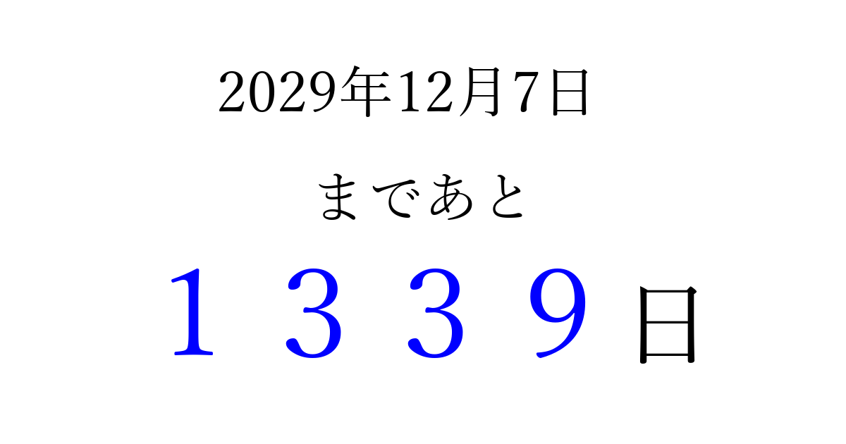 2029年12月7日(金)まで あと 9999 日です 追加すると、トップページからすぐ選べるようになります ※2026/04/08現在の結果です。 最新の状態に更新する ↓シェアして、タイムライン上にカウントダウンを表示しよう!↓ 📤 この結果を共有する Tweet シェア Threads Bluesky 別の日付でカウントダウン 2029年12月のカレンダー このページをブックマークに追加すると、いつでもカウントダウンを確認できます。 (PC: Ctrl+D / Mac: ⌘+D) hitome-notes.comでは以下のページも運営しています。 指定日と期間から日付を計算 | ガチャ確率計算・シミュレーション | プライバシー・ポリシー 運営者:Avocado