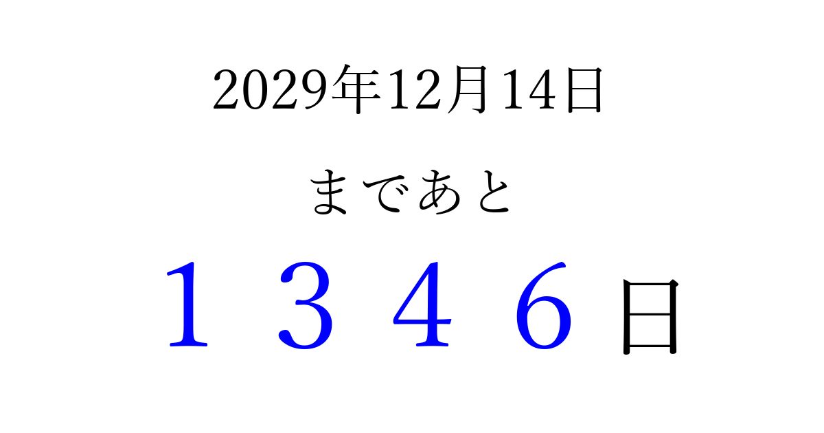 2029年12月14日(金)まで あと 9999 日です 追加すると、トップページからすぐ選べるようになります ※2026/04/08現在の結果です。 最新の状態に更新する ↓シェアして、タイムライン上にカウントダウンを表示しよう!↓ 📤 この結果を共有する Tweet シェア Threads Bluesky 別の日付でカウントダウン 2029年12月のカレンダー このページをブックマークに追加すると、いつでもカウントダウンを確認できます。 (PC: Ctrl+D / Mac: ⌘+D) hitome-notes.comでは以下のページも運営しています。 指定日と期間から日付を計算 | ガチャ確率計算・シミュレーション | プライバシー・ポリシー 運営者:Avocado