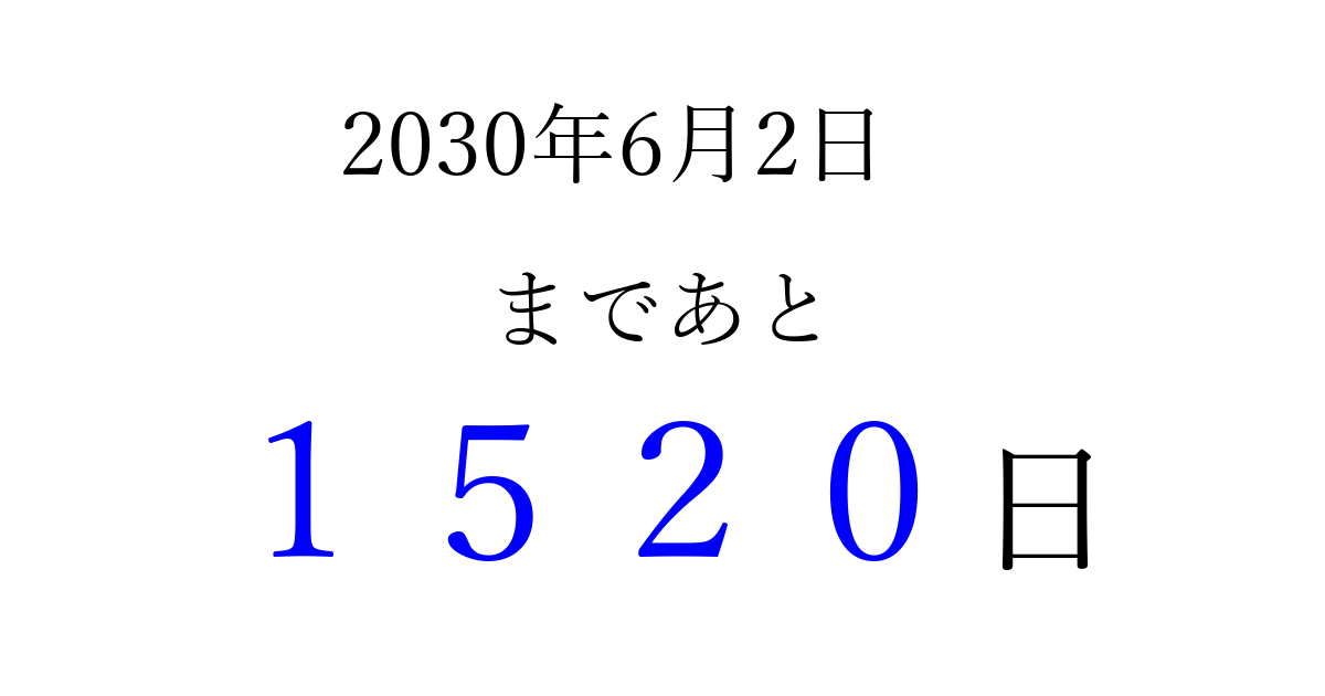 2030年6月2日(日)まで あと 9999 日です 追加すると、トップページからすぐ選べるようになります ※2026/04/04現在の結果です。 最新の状態に更新する ↓シェアして、タイムライン上にカウントダウンを表示しよう!↓ 📤 この結果を共有する Tweet シェア Threads Bluesky 別の日付でカウントダウン 2030年6月のカレンダー このページをブックマークに追加すると、いつでもカウントダウンを確認できます。 (PC: Ctrl+D / Mac: ⌘+D) hitome-notes.comでは以下のページも運営しています。 指定日と期間から日付を計算 | ガチャ確率計算・シミュレーション | プライバシー・ポリシー 運営者:Avocado