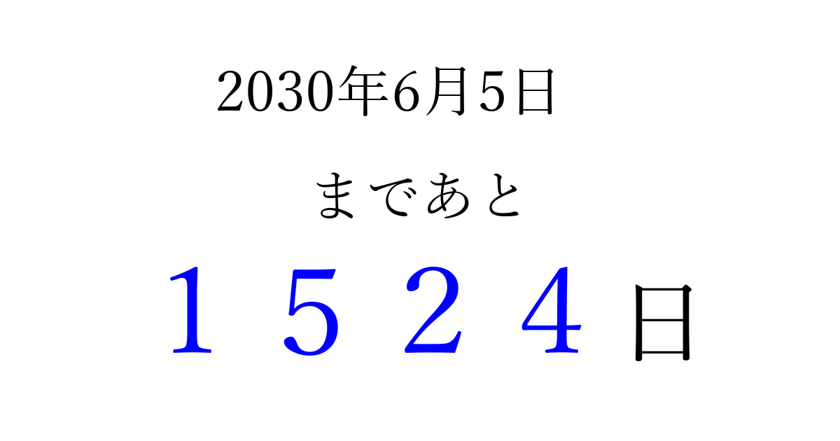 2030年6月5日(水)まで あと 9999 日です 追加すると、トップページからすぐ選べるようになります ※2026/04/03現在の結果です。 最新の状態に更新する ↓シェアして、タイムライン上にカウントダウンを表示しよう!↓ 📤 この結果を共有する Tweet シェア Threads Bluesky 別の日付でカウントダウン 2030年6月のカレンダー このページをブックマークに追加すると、いつでもカウントダウンを確認できます。 (PC: Ctrl+D / Mac: ⌘+D) hitome-notes.comでは以下のページも運営しています。 指定日と期間から日付を計算 | ガチャ確率計算・シミュレーション | プライバシー・ポリシー 運営者:Avocado