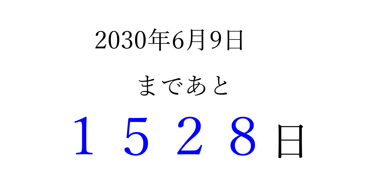 2030年6月9日(日)まで あと 9999 日です 追加すると、トップページからすぐ選べるようになります ※2026/04/03現在の結果です。 最新の状態に更新する ↓シェアして、タイムライン上にカウントダウンを表示しよう!↓ 📤 この結果を共有する Tweet シェア Threads Bluesky 別の日付でカウントダウン 2030年6月のカレンダー このページをブックマークに追加すると、いつでもカウントダウンを確認できます。 (PC: Ctrl+D / Mac: ⌘+D) hitome-notes.comでは以下のページも運営しています。 指定日と期間から日付を計算 | ガチャ確率計算・シミュレーション | プライバシー・ポリシー 運営者:Avocado