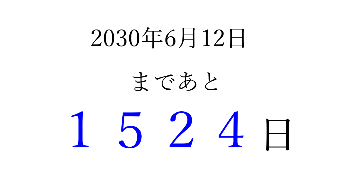 2030年6月12日(水)まで あと 9999 日です 追加すると、トップページからすぐ選べるようになります ※2026/04/10現在の結果です。 最新の状態に更新する ↓シェアして、タイムライン上にカウントダウンを表示しよう!↓ 📤 この結果を共有する Tweet シェア Threads Bluesky 別の日付でカウントダウン 2030年6月のカレンダー このページをブックマークに追加すると、いつでもカウントダウンを確認できます。 (PC: Ctrl+D / Mac: ⌘+D) hitome-notes.comでは以下のページも運営しています。 指定日と期間から日付を計算 | ガチャ確率計算・シミュレーション | プライバシー・ポリシー 運営者:Avocado