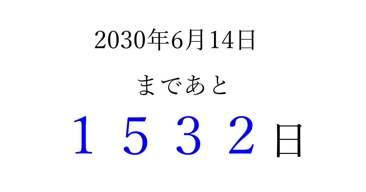 2030年6月14日(金)まで あと 9999 日です 追加すると、トップページからすぐ選べるようになります ※2026/04/04現在の結果です。 最新の状態に更新する ↓シェアして、タイムライン上にカウントダウンを表示しよう!↓ 📤 この結果を共有する Tweet シェア Threads Bluesky 別の日付でカウントダウン 2030年6月のカレンダー このページをブックマークに追加すると、いつでもカウントダウンを確認できます。 (PC: Ctrl+D / Mac: ⌘+D) hitome-notes.comでは以下のページも運営しています。 指定日と期間から日付を計算 | ガチャ確率計算・シミュレーション | プライバシー・ポリシー 運営者:Avocado