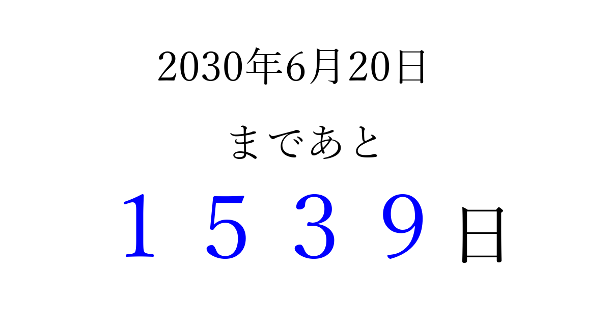 2030年6月20日(木)まで あと 9999 日です 追加すると、トップページからすぐ選べるようになります ※2026/04/03現在の結果です。 最新の状態に更新する ↓シェアして、タイムライン上にカウントダウンを表示しよう!↓ 📤 この結果を共有する Tweet シェア Threads Bluesky 別の日付でカウントダウン 2030年6月のカレンダー このページをブックマークに追加すると、いつでもカウントダウンを確認できます。 (PC: Ctrl+D / Mac: ⌘+D) hitome-notes.comでは以下のページも運営しています。 指定日と期間から日付を計算 | ガチャ確率計算・シミュレーション | プライバシー・ポリシー 運営者:Avocado