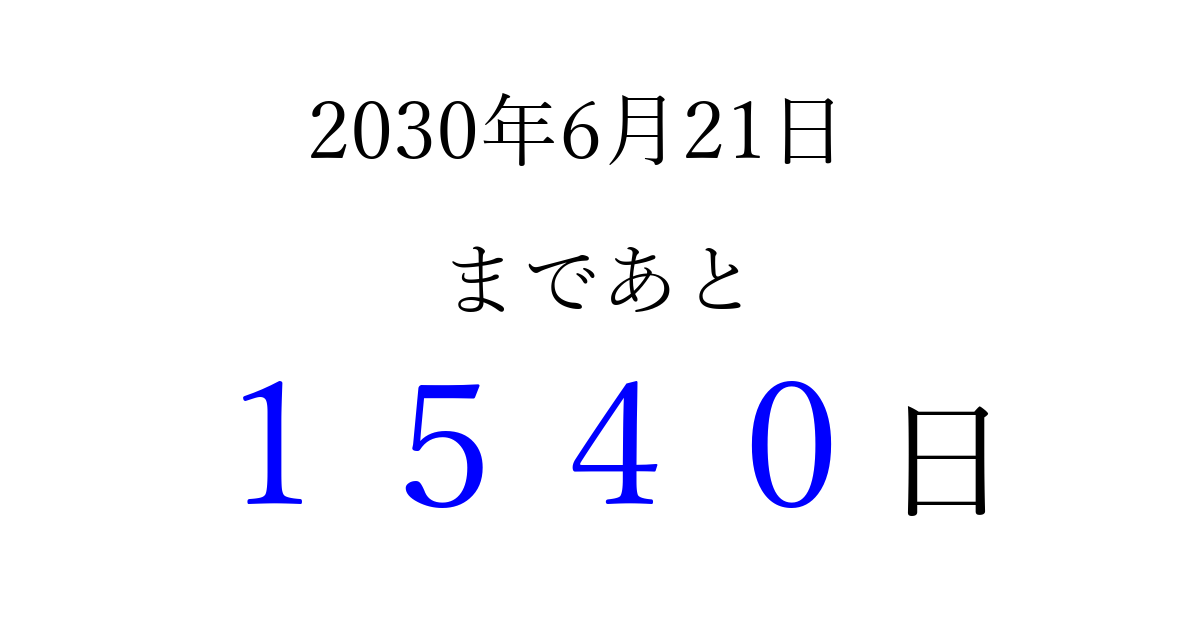 2030年6月21日(金)まで あと 9999 日です 追加すると、トップページからすぐ選べるようになります ※2026/04/03現在の結果です。 最新の状態に更新する ↓シェアして、タイムライン上にカウントダウンを表示しよう!↓ 📤 この結果を共有する Tweet シェア Threads Bluesky 別の日付でカウントダウン 2030年6月のカレンダー このページをブックマークに追加すると、いつでもカウントダウンを確認できます。 (PC: Ctrl+D / Mac: ⌘+D) hitome-notes.comでは以下のページも運営しています。 指定日と期間から日付を計算 | ガチャ確率計算・シミュレーション | プライバシー・ポリシー 運営者:Avocado