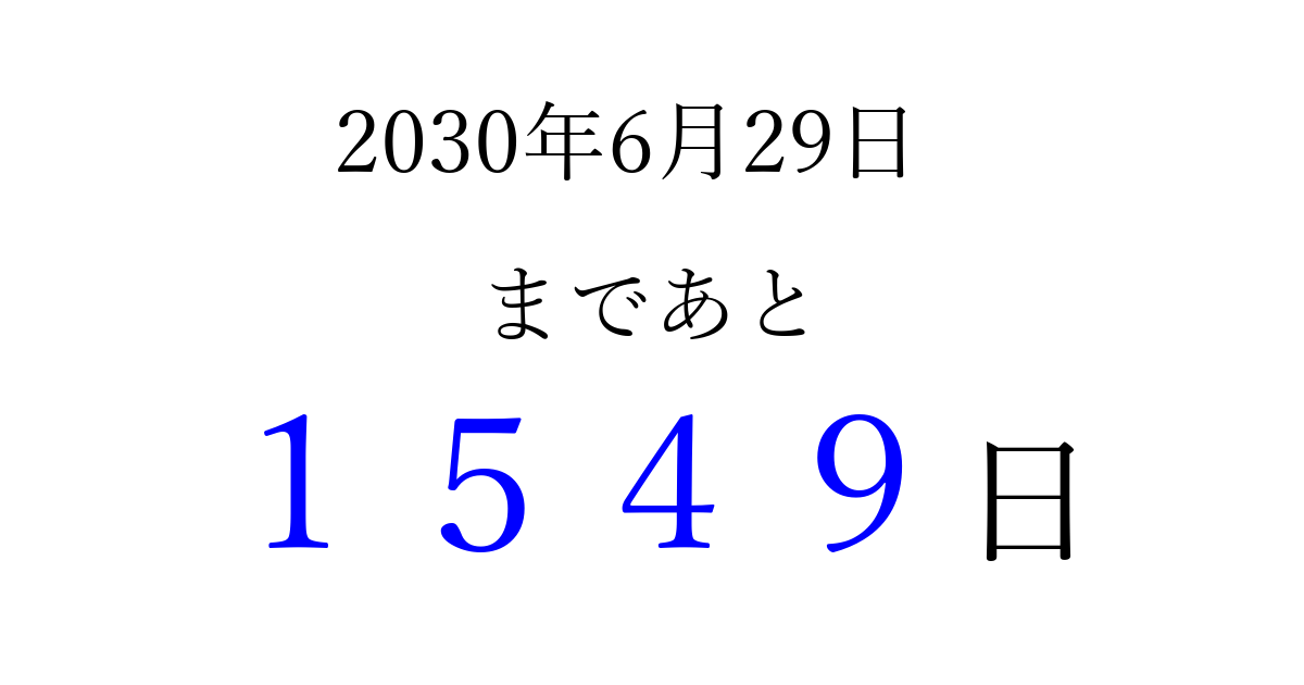 2030年6月29日(土)まで あと 9999 日です 追加すると、トップページからすぐ選べるようになります ※2026/04/02現在の結果です。 最新の状態に更新する ↓シェアして、タイムライン上にカウントダウンを表示しよう!↓ 📤 この結果を共有する Tweet シェア Threads Bluesky 別の日付でカウントダウン 2030年6月のカレンダー このページをブックマークに追加すると、いつでもカウントダウンを確認できます。 (PC: Ctrl+D / Mac: ⌘+D) hitome-notes.comでは以下のページも運営しています。 指定日と期間から日付を計算 | ガチャ確率計算・シミュレーション | プライバシー・ポリシー 運営者:Avocado