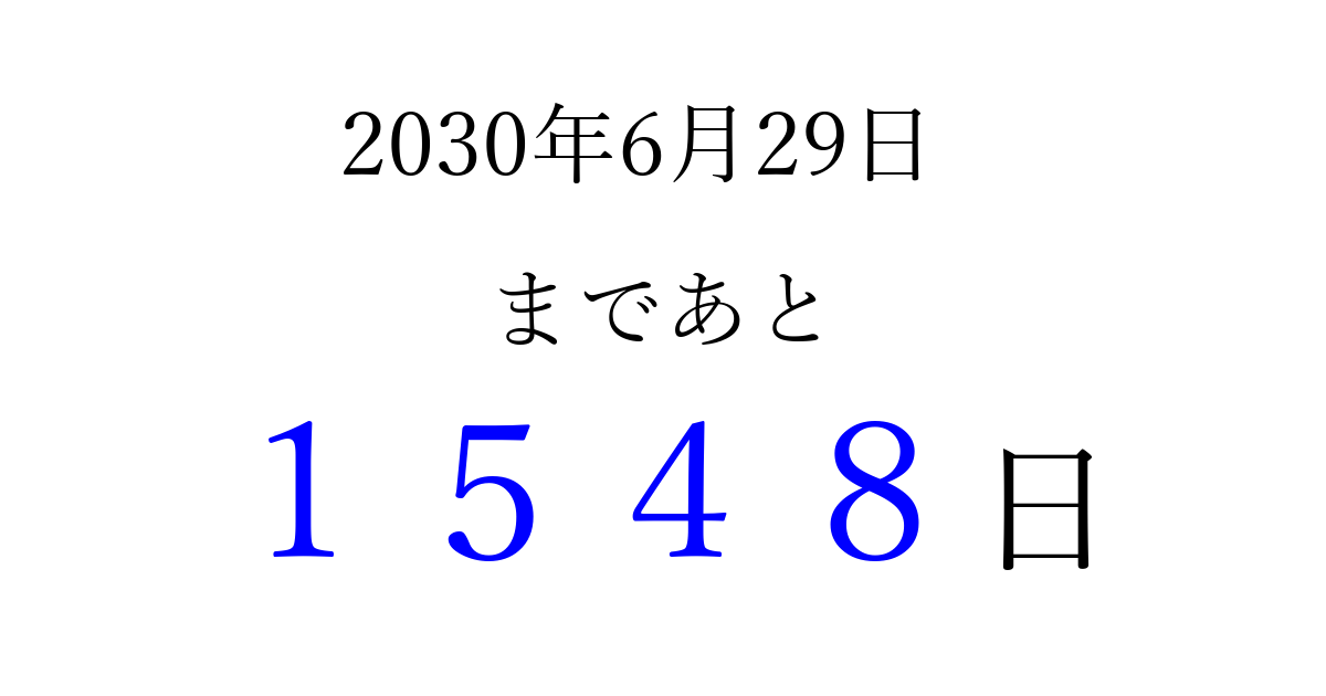 2030年6月29日(土)まで あと 9999 日です 追加すると、トップページからすぐ選べるようになります ※2026/04/03現在の結果です。 最新の状態に更新する ↓シェアして、タイムライン上にカウントダウンを表示しよう!↓ 📤 この結果を共有する Tweet シェア Threads Bluesky 別の日付でカウントダウン 2030年6月のカレンダー このページをブックマークに追加すると、いつでもカウントダウンを確認できます。 (PC: Ctrl+D / Mac: ⌘+D) hitome-notes.comでは以下のページも運営しています。 指定日と期間から日付を計算 | ガチャ確率計算・シミュレーション | プライバシー・ポリシー 運営者:Avocado