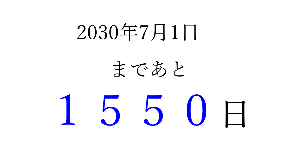 2030年7月1日(月)まで あと 9999 日です 追加すると、トップページからすぐ選べるようになります ※2026/04/03現在の結果です。 最新の状態に更新する ↓シェアして、タイムライン上にカウントダウンを表示しよう!↓ 📤 この結果を共有する Tweet シェア Threads Bluesky 別の日付でカウントダウン 2030年7月のカレンダー このページをブックマークに追加すると、いつでもカウントダウンを確認できます。 (PC: Ctrl+D / Mac: ⌘+D) hitome-notes.comでは以下のページも運営しています。 指定日と期間から日付を計算 | ガチャ確率計算・シミュレーション | プライバシー・ポリシー 運営者:Avocado