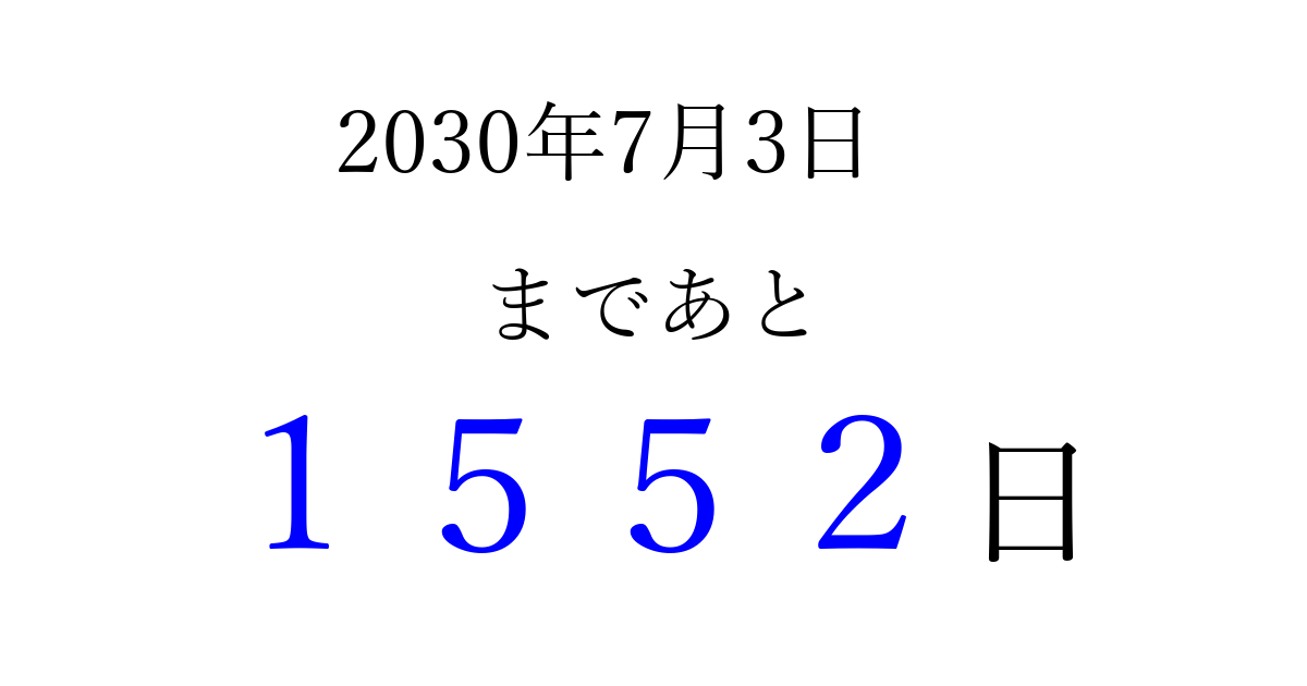 2030年7月3日(水)まで あと 9999 日です 追加すると、トップページからすぐ選べるようになります ※2026/04/03現在の結果です。 最新の状態に更新する ↓シェアして、タイムライン上にカウントダウンを表示しよう!↓ 📤 この結果を共有する Tweet シェア Threads Bluesky 別の日付でカウントダウン 2030年7月のカレンダー このページをブックマークに追加すると、いつでもカウントダウンを確認できます。 (PC: Ctrl+D / Mac: ⌘+D) hitome-notes.comでは以下のページも運営しています。 指定日と期間から日付を計算 | ガチャ確率計算・シミュレーション | プライバシー・ポリシー 運営者:Avocado