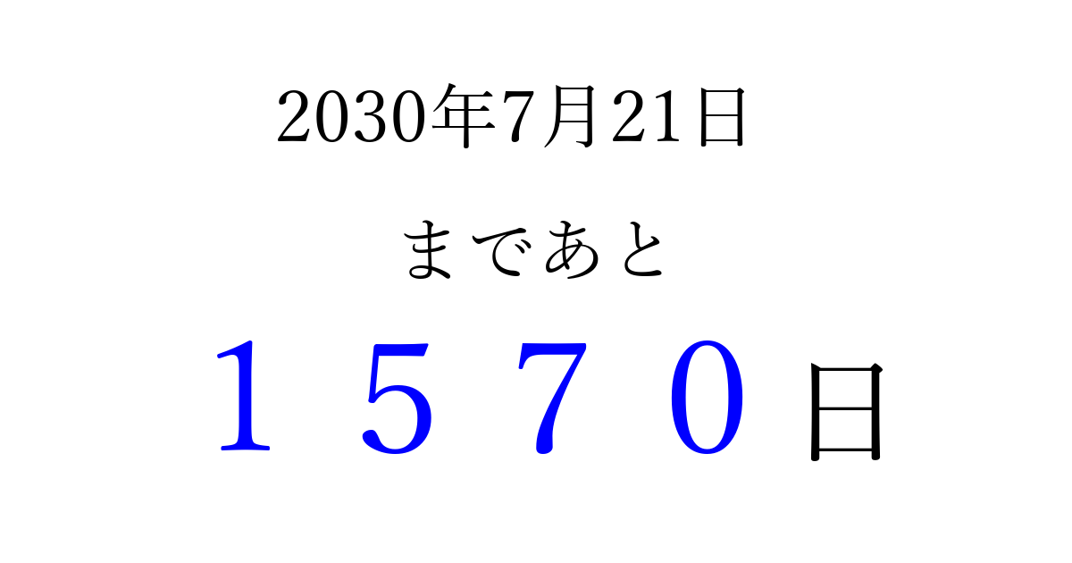 2030年7月21日(日)まで あと 9999 日です 追加すると、トップページからすぐ選べるようになります ※2026/04/03現在の結果です。 最新の状態に更新する ↓シェアして、タイムライン上にカウントダウンを表示しよう!↓ 📤 この結果を共有する Tweet シェア Threads Bluesky 別の日付でカウントダウン 2030年7月のカレンダー このページをブックマークに追加すると、いつでもカウントダウンを確認できます。 (PC: Ctrl+D / Mac: ⌘+D) hitome-notes.comでは以下のページも運営しています。 指定日と期間から日付を計算 | ガチャ確率計算・シミュレーション | プライバシー・ポリシー 運営者:Avocado