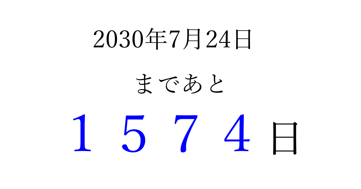 2030年7月24日(水)まで あと 9999 日です 追加すると、トップページからすぐ選べるようになります ※2026/04/02現在の結果です。 最新の状態に更新する ↓シェアして、タイムライン上にカウントダウンを表示しよう!↓ 📤 この結果を共有する Tweet シェア Threads Bluesky 別の日付でカウントダウン 2030年7月のカレンダー このページをブックマークに追加すると、いつでもカウントダウンを確認できます。 (PC: Ctrl+D / Mac: ⌘+D) hitome-notes.comでは以下のページも運営しています。 指定日と期間から日付を計算 | ガチャ確率計算・シミュレーション | プライバシー・ポリシー 運営者:Avocado