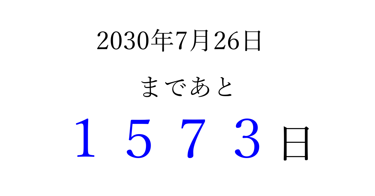 2030年7月26日(金)まで あと 9999 日です 追加すると、トップページからすぐ選べるようになります ※2026/04/05現在の結果です。 最新の状態に更新する ↓シェアして、タイムライン上にカウントダウンを表示しよう!↓ 📤 この結果を共有する Tweet シェア Threads Bluesky 別の日付でカウントダウン 2030年7月のカレンダー このページをブックマークに追加すると、いつでもカウントダウンを確認できます。 (PC: Ctrl+D / Mac: ⌘+D) hitome-notes.comでは以下のページも運営しています。 指定日と期間から日付を計算 | ガチャ確率計算・シミュレーション | プライバシー・ポリシー 運営者:Avocado