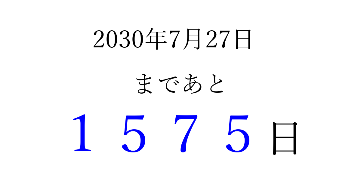 2030年7月27日(土)まで あと 9999 日です 追加すると、トップページからすぐ選べるようになります ※2026/04/04現在の結果です。 最新の状態に更新する ↓シェアして、タイムライン上にカウントダウンを表示しよう!↓ 📤 この結果を共有する Tweet シェア Threads Bluesky 別の日付でカウントダウン 2030年7月のカレンダー このページをブックマークに追加すると、いつでもカウントダウンを確認できます。 (PC: Ctrl+D / Mac: ⌘+D) hitome-notes.comでは以下のページも運営しています。 指定日と期間から日付を計算 | ガチャ確率計算・シミュレーション | プライバシー・ポリシー 運営者:Avocado