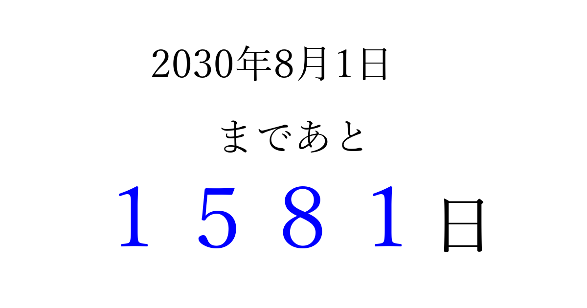 2030年8月1日(木)まで あと 9999 日です 追加すると、トップページからすぐ選べるようになります ※2026/04/03現在の結果です。 最新の状態に更新する ↓シェアして、タイムライン上にカウントダウンを表示しよう!↓ 📤 この結果を共有する Tweet シェア Threads Bluesky 別の日付でカウントダウン 2030年8月のカレンダー このページをブックマークに追加すると、いつでもカウントダウンを確認できます。 (PC: Ctrl+D / Mac: ⌘+D) hitome-notes.comでは以下のページも運営しています。 指定日と期間から日付を計算 | ガチャ確率計算・シミュレーション | プライバシー・ポリシー 運営者:Avocado