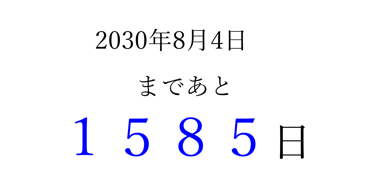 2030年8月4日(日)まで あと 9999 日です 追加すると、トップページからすぐ選べるようになります ※2026/04/02現在の結果です。 最新の状態に更新する ↓シェアして、タイムライン上にカウントダウンを表示しよう!↓ 📤 この結果を共有する Tweet シェア Threads Bluesky 別の日付でカウントダウン 2030年8月のカレンダー このページをブックマークに追加すると、いつでもカウントダウンを確認できます。 (PC: Ctrl+D / Mac: ⌘+D) hitome-notes.comでは以下のページも運営しています。 指定日と期間から日付を計算 | ガチャ確率計算・シミュレーション | プライバシー・ポリシー 運営者:Avocado