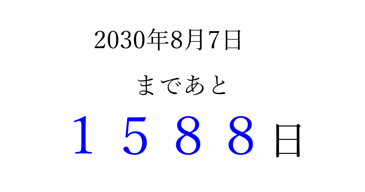 2030年8月7日(水)まで あと 9999 日です 追加すると、トップページからすぐ選べるようになります ※2026/04/02現在の結果です。 最新の状態に更新する ↓シェアして、タイムライン上にカウントダウンを表示しよう!↓ 📤 この結果を共有する Tweet シェア Threads Bluesky 別の日付でカウントダウン 2030年8月のカレンダー このページをブックマークに追加すると、いつでもカウントダウンを確認できます。 (PC: Ctrl+D / Mac: ⌘+D) hitome-notes.comでは以下のページも運営しています。 指定日と期間から日付を計算 | ガチャ確率計算・シミュレーション | プライバシー・ポリシー 運営者:Avocado