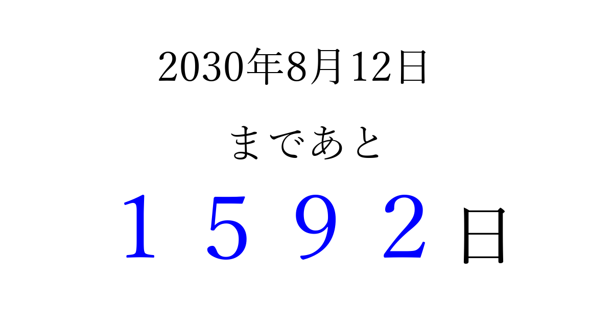 2030年8月12日(月)まで あと 9999 日です 追加すると、トップページからすぐ選べるようになります ※2026/04/03現在の結果です。 最新の状態に更新する ↓シェアして、タイムライン上にカウントダウンを表示しよう!↓ 📤 この結果を共有する Tweet シェア Threads Bluesky 別の日付でカウントダウン 2030年8月のカレンダー このページをブックマークに追加すると、いつでもカウントダウンを確認できます。 (PC: Ctrl+D / Mac: ⌘+D) hitome-notes.comでは以下のページも運営しています。 指定日と期間から日付を計算 | ガチャ確率計算・シミュレーション | プライバシー・ポリシー 運営者:Avocado