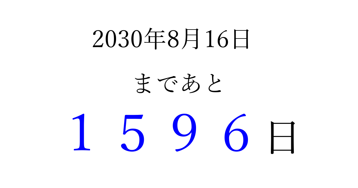 2030年8月16日(金)まで あと 9999 日です 追加すると、トップページからすぐ選べるようになります ※2026/04/03現在の結果です。 最新の状態に更新する ↓シェアして、タイムライン上にカウントダウンを表示しよう!↓ 📤 この結果を共有する Tweet シェア Threads Bluesky 別の日付でカウントダウン 2030年8月のカレンダー このページをブックマークに追加すると、いつでもカウントダウンを確認できます。 (PC: Ctrl+D / Mac: ⌘+D) hitome-notes.comでは以下のページも運営しています。 指定日と期間から日付を計算 | ガチャ確率計算・シミュレーション | プライバシー・ポリシー 運営者:Avocado