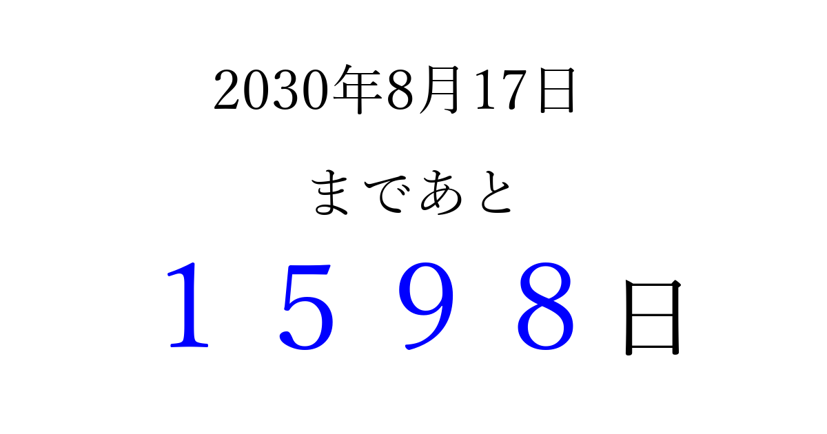 2030年8月17日(土)まで あと 9999 日です 追加すると、トップページからすぐ選べるようになります ※2026/04/02現在の結果です。 最新の状態に更新する ↓シェアして、タイムライン上にカウントダウンを表示しよう!↓ 📤 この結果を共有する Tweet シェア Threads Bluesky 別の日付でカウントダウン 2030年8月のカレンダー このページをブックマークに追加すると、いつでもカウントダウンを確認できます。 (PC: Ctrl+D / Mac: ⌘+D) hitome-notes.comでは以下のページも運営しています。 指定日と期間から日付を計算 | ガチャ確率計算・シミュレーション | プライバシー・ポリシー 運営者:Avocado