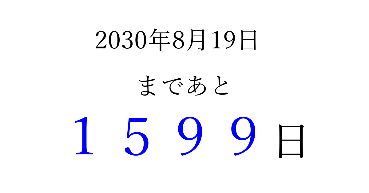 2030年8月19日(月)まで あと 9999 日です 追加すると、トップページからすぐ選べるようになります ※2026/04/03現在の結果です。 最新の状態に更新する ↓シェアして、タイムライン上にカウントダウンを表示しよう!↓ 📤 この結果を共有する Tweet シェア Threads Bluesky 別の日付でカウントダウン 2030年8月のカレンダー このページをブックマークに追加すると、いつでもカウントダウンを確認できます。 (PC: Ctrl+D / Mac: ⌘+D) hitome-notes.comでは以下のページも運営しています。 指定日と期間から日付を計算 | ガチャ確率計算・シミュレーション | プライバシー・ポリシー 運営者:Avocado
