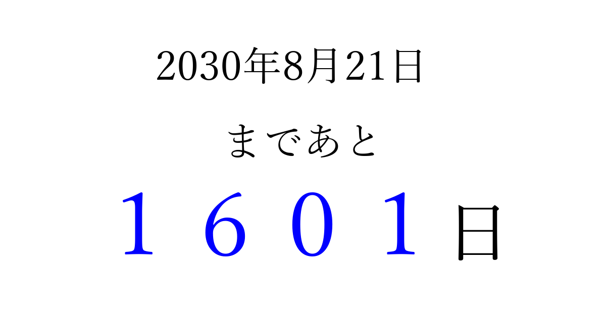 2030年8月21日(水)まで あと 9999 日です 追加すると、トップページからすぐ選べるようになります ※2026/04/03現在の結果です。 最新の状態に更新する ↓シェアして、タイムライン上にカウントダウンを表示しよう!↓ 📤 この結果を共有する Tweet シェア Threads Bluesky 別の日付でカウントダウン 2030年8月のカレンダー このページをブックマークに追加すると、いつでもカウントダウンを確認できます。 (PC: Ctrl+D / Mac: ⌘+D) hitome-notes.comでは以下のページも運営しています。 指定日と期間から日付を計算 | ガチャ確率計算・シミュレーション | プライバシー・ポリシー 運営者:Avocado