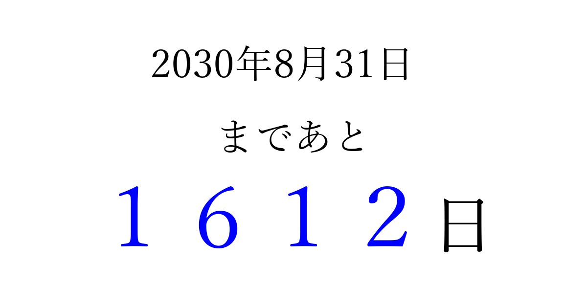 2030年8月31日(土)まで あと 9999 日です 追加すると、トップページからすぐ選べるようになります ※2026/04/02現在の結果です。 最新の状態に更新する ↓シェアして、タイムライン上にカウントダウンを表示しよう!↓ 📤 この結果を共有する Tweet シェア Threads Bluesky 別の日付でカウントダウン 2030年8月のカレンダー このページをブックマークに追加すると、いつでもカウントダウンを確認できます。 (PC: Ctrl+D / Mac: ⌘+D) hitome-notes.comでは以下のページも運営しています。 指定日と期間から日付を計算 | ガチャ確率計算・シミュレーション | プライバシー・ポリシー 運営者:Avocado