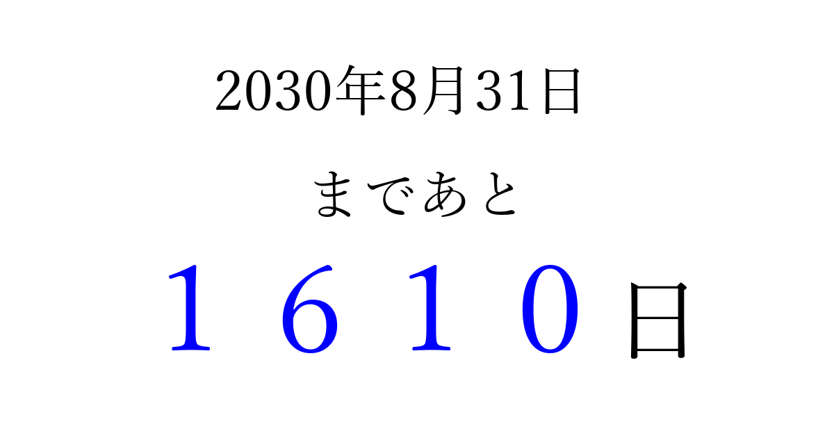 2030年8月31日(土)まで あと 9999 日です 追加すると、トップページからすぐ選べるようになります ※2026/04/04現在の結果です。 最新の状態に更新する ↓シェアして、タイムライン上にカウントダウンを表示しよう!↓ 📤 この結果を共有する Tweet シェア Threads Bluesky 別の日付でカウントダウン 2030年8月のカレンダー このページをブックマークに追加すると、いつでもカウントダウンを確認できます。 (PC: Ctrl+D / Mac: ⌘+D) hitome-notes.comでは以下のページも運営しています。 指定日と期間から日付を計算 | ガチャ確率計算・シミュレーション | プライバシー・ポリシー 運営者:Avocado