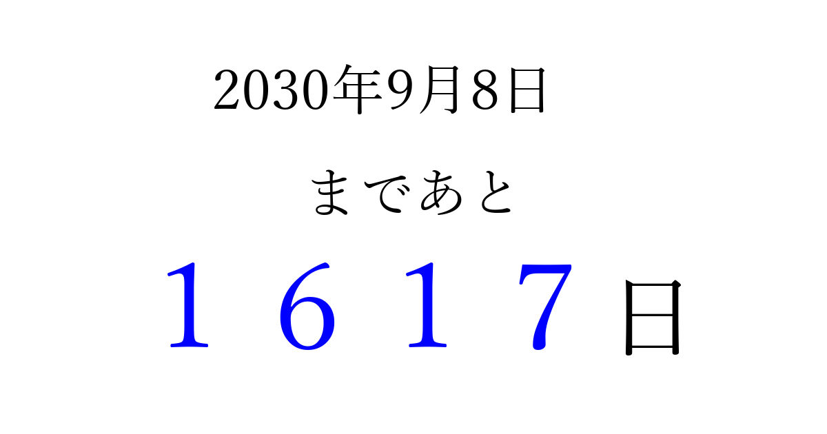 2030年9月8日(日)まで あと 9999 日です 追加すると、トップページからすぐ選べるようになります ※2026/04/05現在の結果です。 最新の状態に更新する ↓シェアして、タイムライン上にカウントダウンを表示しよう!↓ 📤 この結果を共有する Tweet シェア Threads Bluesky 別の日付でカウントダウン 2030年9月のカレンダー このページをブックマークに追加すると、いつでもカウントダウンを確認できます。 (PC: Ctrl+D / Mac: ⌘+D) hitome-notes.comでは以下のページも運営しています。 指定日と期間から日付を計算 | ガチャ確率計算・シミュレーション | プライバシー・ポリシー 運営者:Avocado