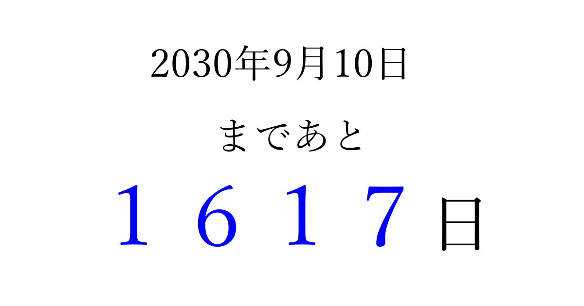 2030年9月10日(火)まで あと 9999 日です 追加すると、トップページからすぐ選べるようになります ※2026/04/07現在の結果です。 最新の状態に更新する ↓シェアして、タイムライン上にカウントダウンを表示しよう!↓ 📤 この結果を共有する Tweet シェア Threads Bluesky 別の日付でカウントダウン 2030年9月のカレンダー このページをブックマークに追加すると、いつでもカウントダウンを確認できます。 (PC: Ctrl+D / Mac: ⌘+D) hitome-notes.comでは以下のページも運営しています。 指定日と期間から日付を計算 | ガチャ確率計算・シミュレーション | プライバシー・ポリシー 運営者:Avocado