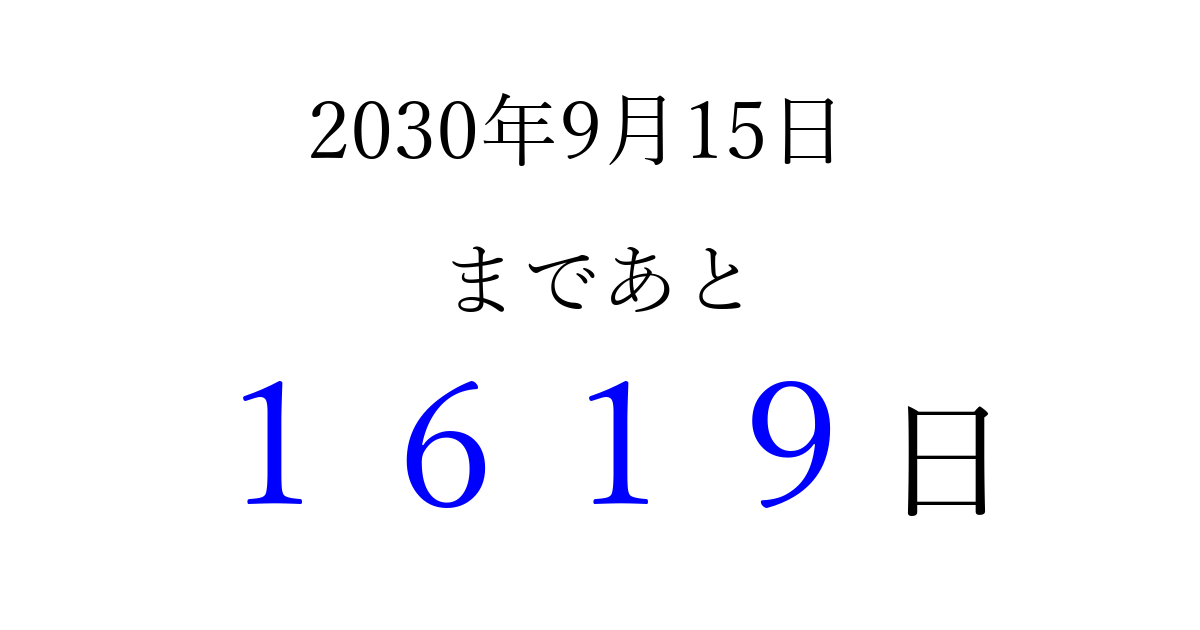 2030年9月15日(日)まで あと 9999 日です 追加すると、トップページからすぐ選べるようになります ※2026/04/10現在の結果です。 最新の状態に更新する ↓シェアして、タイムライン上にカウントダウンを表示しよう!↓ 📤 この結果を共有する Tweet シェア Threads Bluesky 別の日付でカウントダウン 2030年9月のカレンダー このページをブックマークに追加すると、いつでもカウントダウンを確認できます。 (PC: Ctrl+D / Mac: ⌘+D) hitome-notes.comでは以下のページも運営しています。 指定日と期間から日付を計算 | ガチャ確率計算・シミュレーション | プライバシー・ポリシー 運営者:Avocado