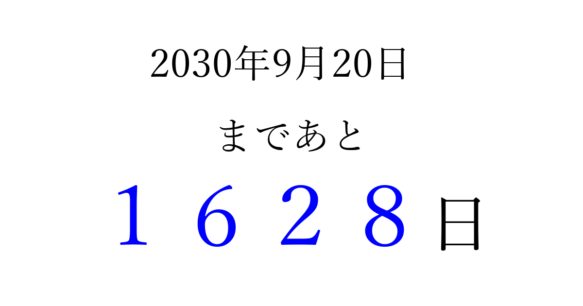 2030年9月20日(金)まで あと 9999 日です 追加すると、トップページからすぐ選べるようになります ※2026/04/06現在の結果です。 最新の状態に更新する ↓シェアして、タイムライン上にカウントダウンを表示しよう!↓ 📤 この結果を共有する Tweet シェア Threads Bluesky 別の日付でカウントダウン 2030年9月のカレンダー このページをブックマークに追加すると、いつでもカウントダウンを確認できます。 (PC: Ctrl+D / Mac: ⌘+D) hitome-notes.comでは以下のページも運営しています。 指定日と期間から日付を計算 | ガチャ確率計算・シミュレーション | プライバシー・ポリシー 運営者:Avocado