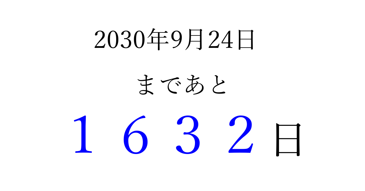 2030年9月24日(火)まで あと 9999 日です 追加すると、トップページからすぐ選べるようになります ※2026/04/06現在の結果です。 最新の状態に更新する ↓シェアして、タイムライン上にカウントダウンを表示しよう!↓ 📤 この結果を共有する Tweet シェア Threads Bluesky 別の日付でカウントダウン 2030年9月のカレンダー このページをブックマークに追加すると、いつでもカウントダウンを確認できます。 (PC: Ctrl+D / Mac: ⌘+D) hitome-notes.comでは以下のページも運営しています。 指定日と期間から日付を計算 | ガチャ確率計算・シミュレーション | プライバシー・ポリシー 運営者:Avocado